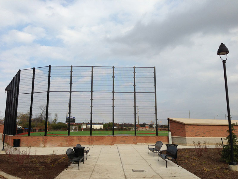 Панели ограждений усилены за счет применения сдвоенных горизонтальных прутков и изгибов наполнения, выполняющих функции своеобразных ребер жесткости. Такое решение позволяет конструкции выдерживать значительные статические механические нагрузки, а главное — ударные воздействия от соприкосновения панелей со спортивными снарядами и спортсменами.